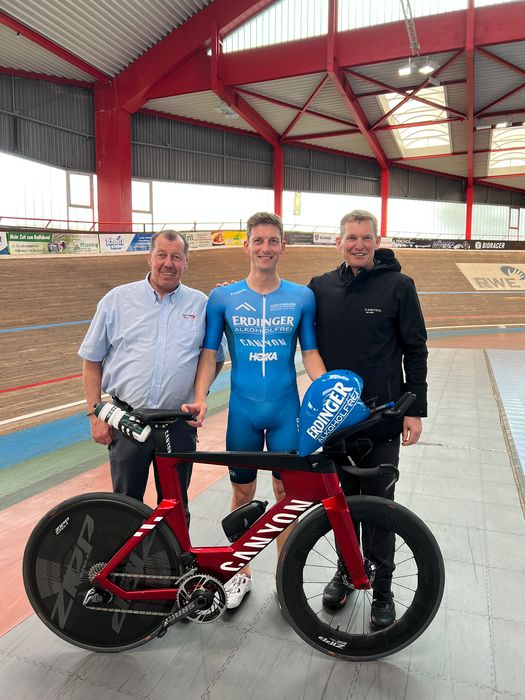 Florian Angert fand auch mit seinem Team und Sponsor Erdinger den Weg ins Sportforum. Unterstützt wurde er auch vom Sponsor und Radhersteller Canyon, mit dabei war auch Andreas Walzer Global Director Pro Sport von Canyon.