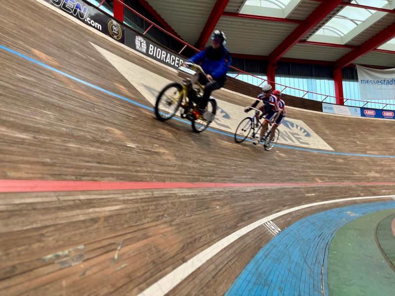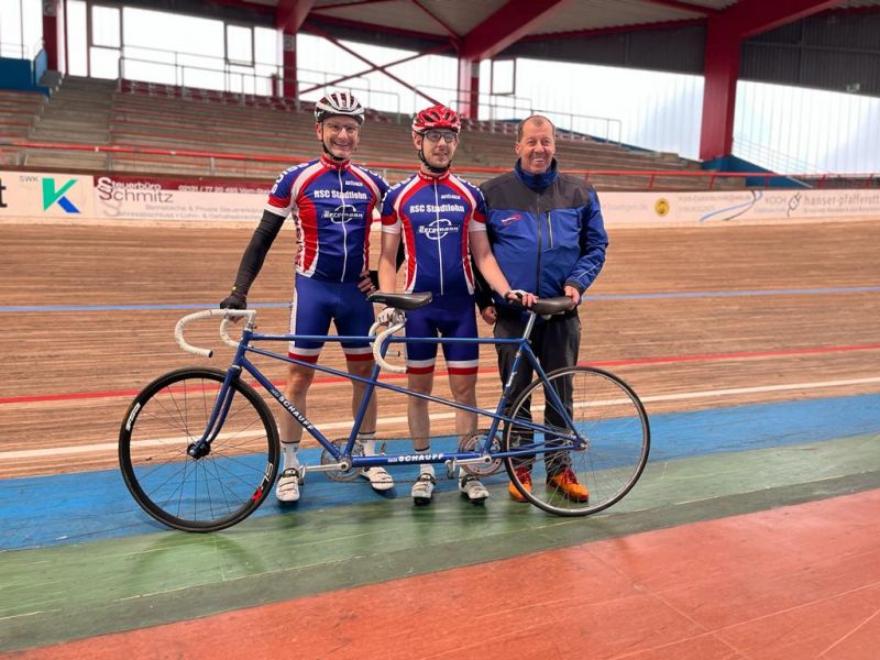 Kurz vor dem Jahresende kamen Sportlerinnen und Sportler aus Stadtlohn und Umgebung für 2 Stunden auf die Radrennbahn nach Büttgen. Unter anderem nahmen auch Guido und Marco Schwarzer, Vater und Sohn, teil. Guido hatte kurzfristig, als Weihnachtsgeschenk ein Tandem für sich und seinen schwer sehbehinderten Sohn gebucht, um diesem eine besondere Freude zu machen. Das ist ihm auch gelungen. Marco hatte großen Spaß auf der Bahn und nachdem der Manager des Sportforums Hermann Schiffer für die übrigen Teilnehmer bereits mit dem Derny gefahren ist, bekamen auch Guido und Marco ihre Dernyeinheit.