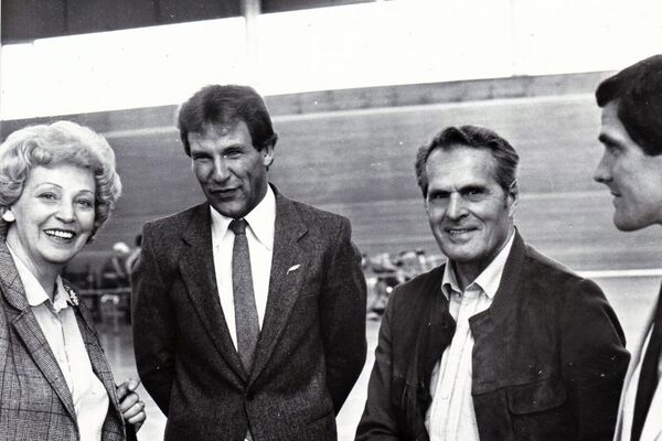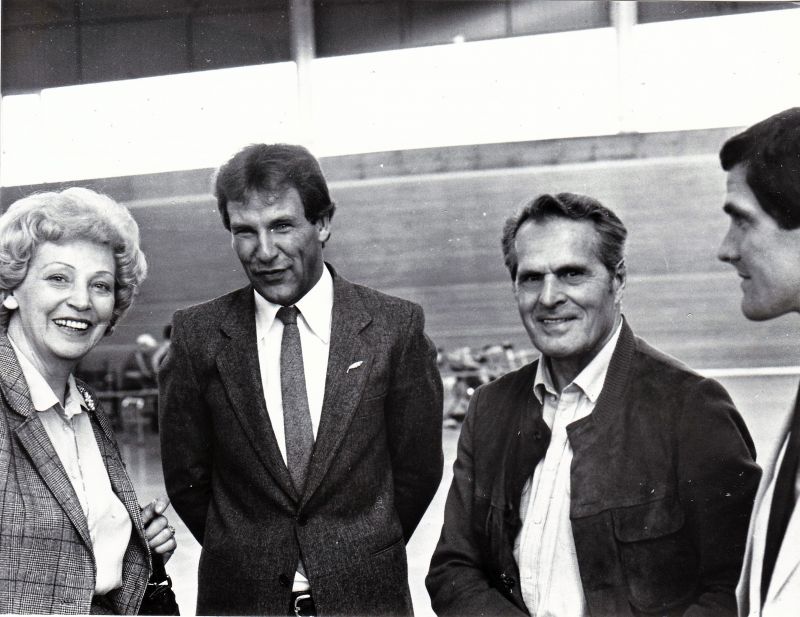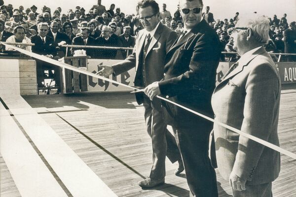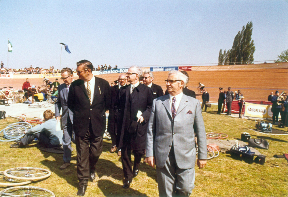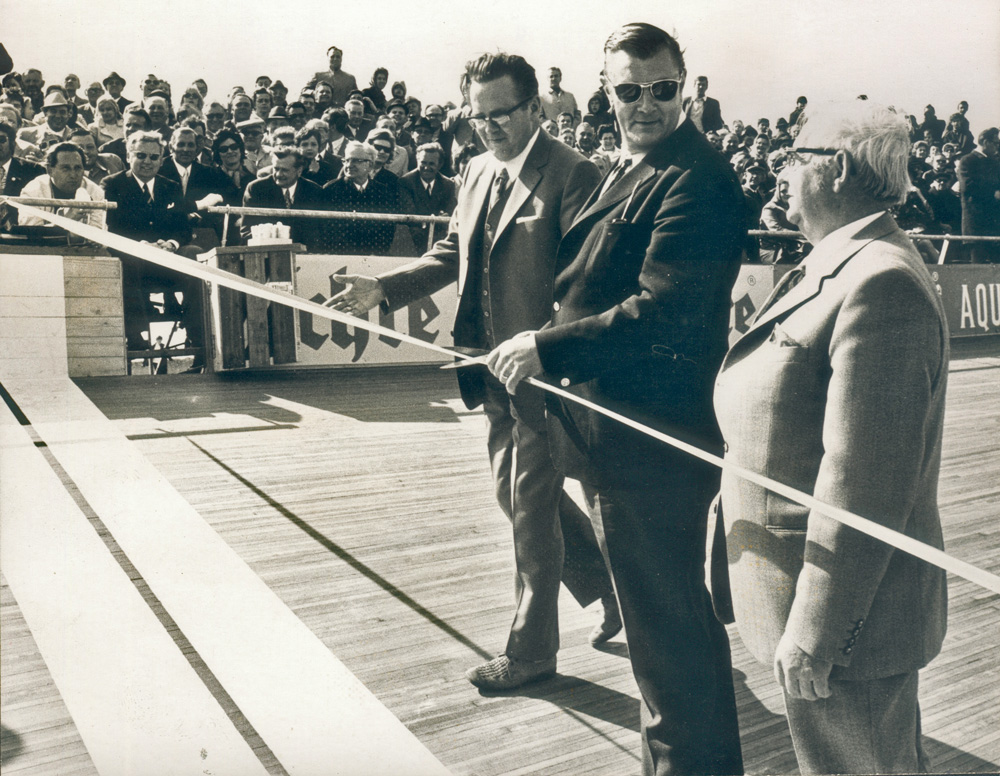 1971 Eröffnung der Radrennbahn mit NRW-Innenminister Willi Weyer (l.) und Bürgermeister der Gemeinde Büttgen, Eduard Klüber (r.), dahinter v.l. Gemeindedirektor Arnold Möllmann, Hermann Dropmann und Peter Kirchhartz; Foto: (c) Egon W. Vossen -
